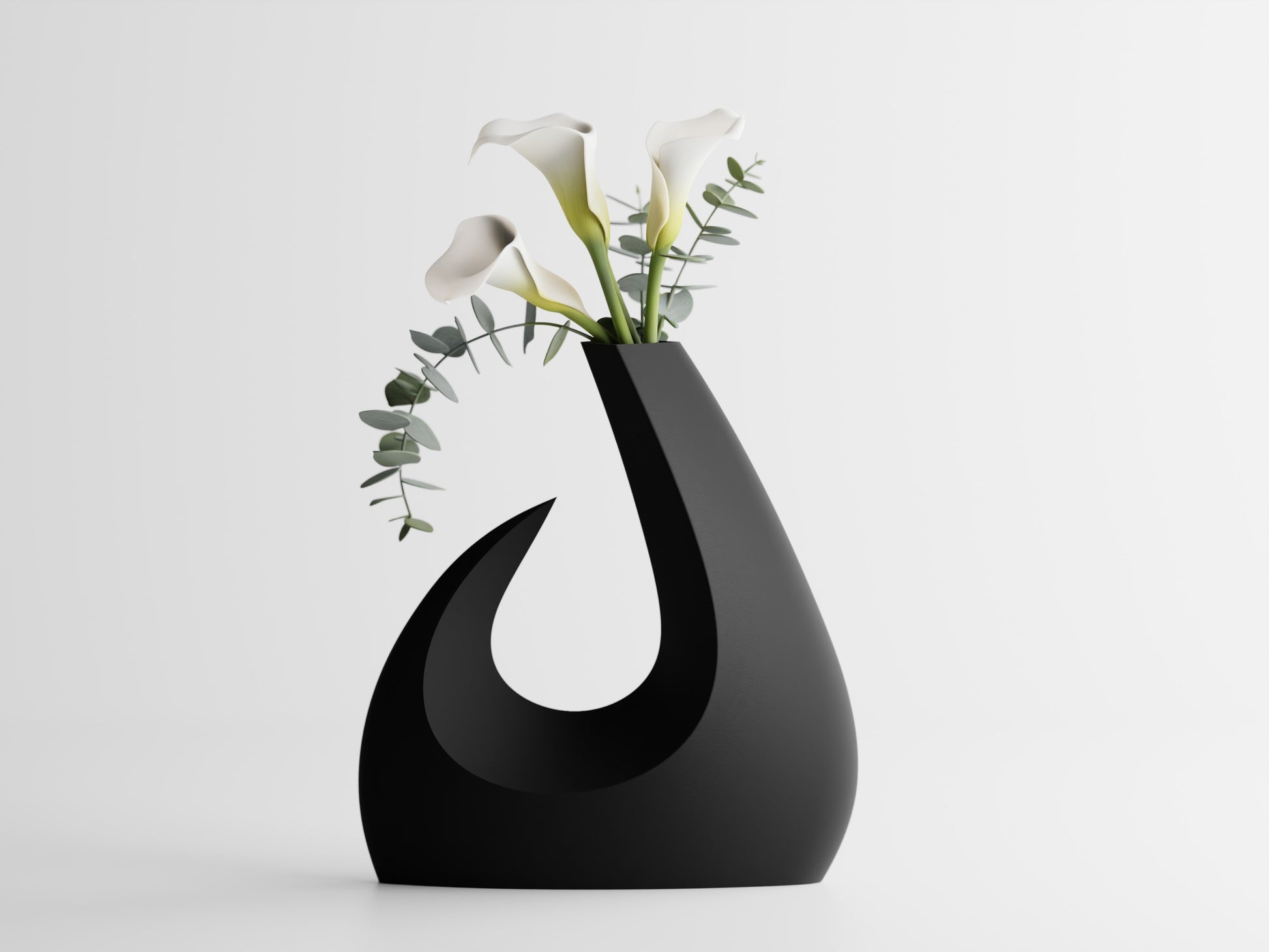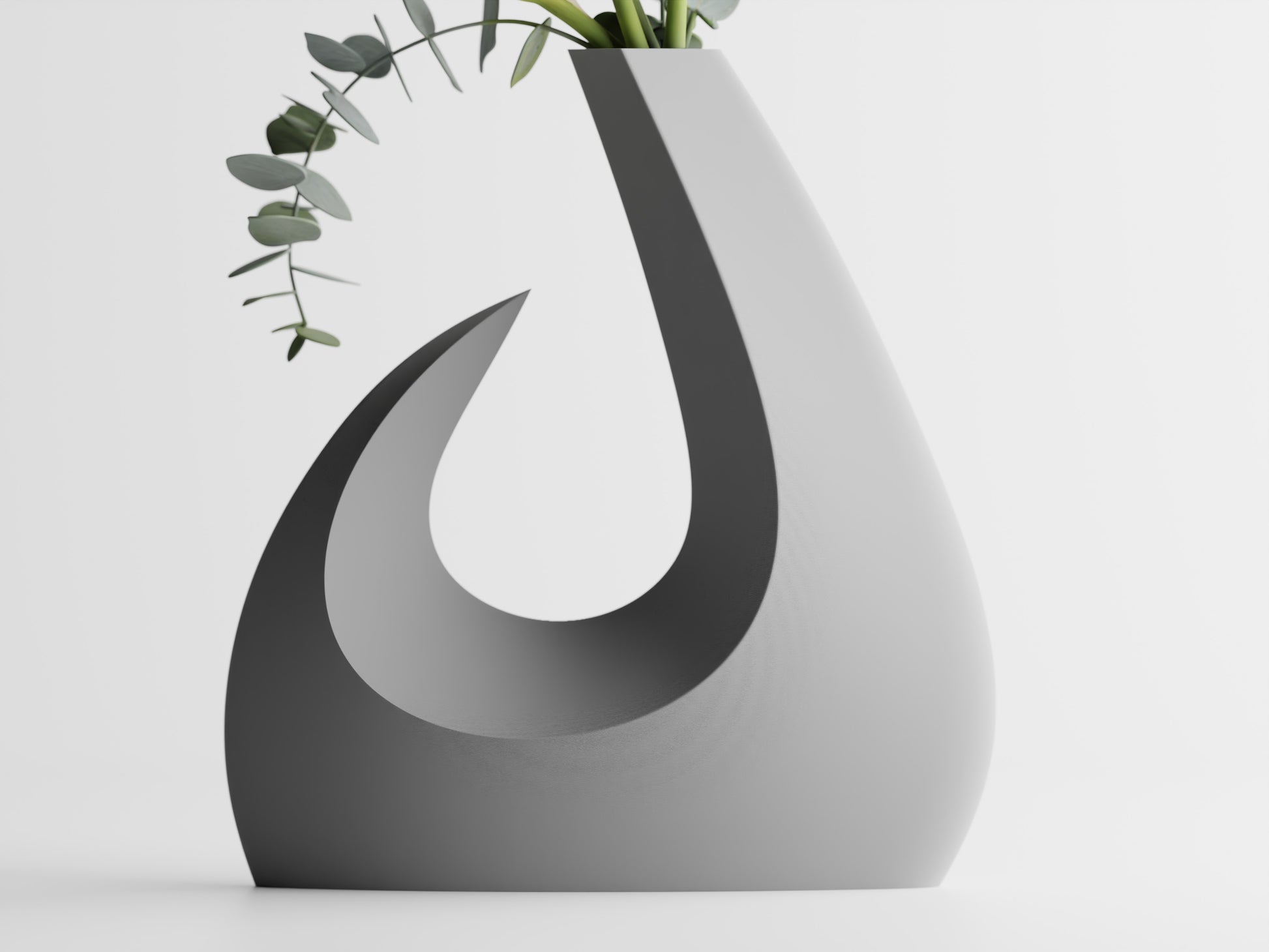 Denna vas kombinerar skulptural form med funktionell design och fungerar både som blomhållare och dekorativt konstföremål. Den organiska silhuetten med det karakteristiska snidade hålet skapar ett lätt och elegant uttryck, vilket ger vasen ett nästan svävande utseende. Formen är inspirerad av naturliga rörelser och mjuka kurvor, vilket gör den till ett blickfång i alla rum.