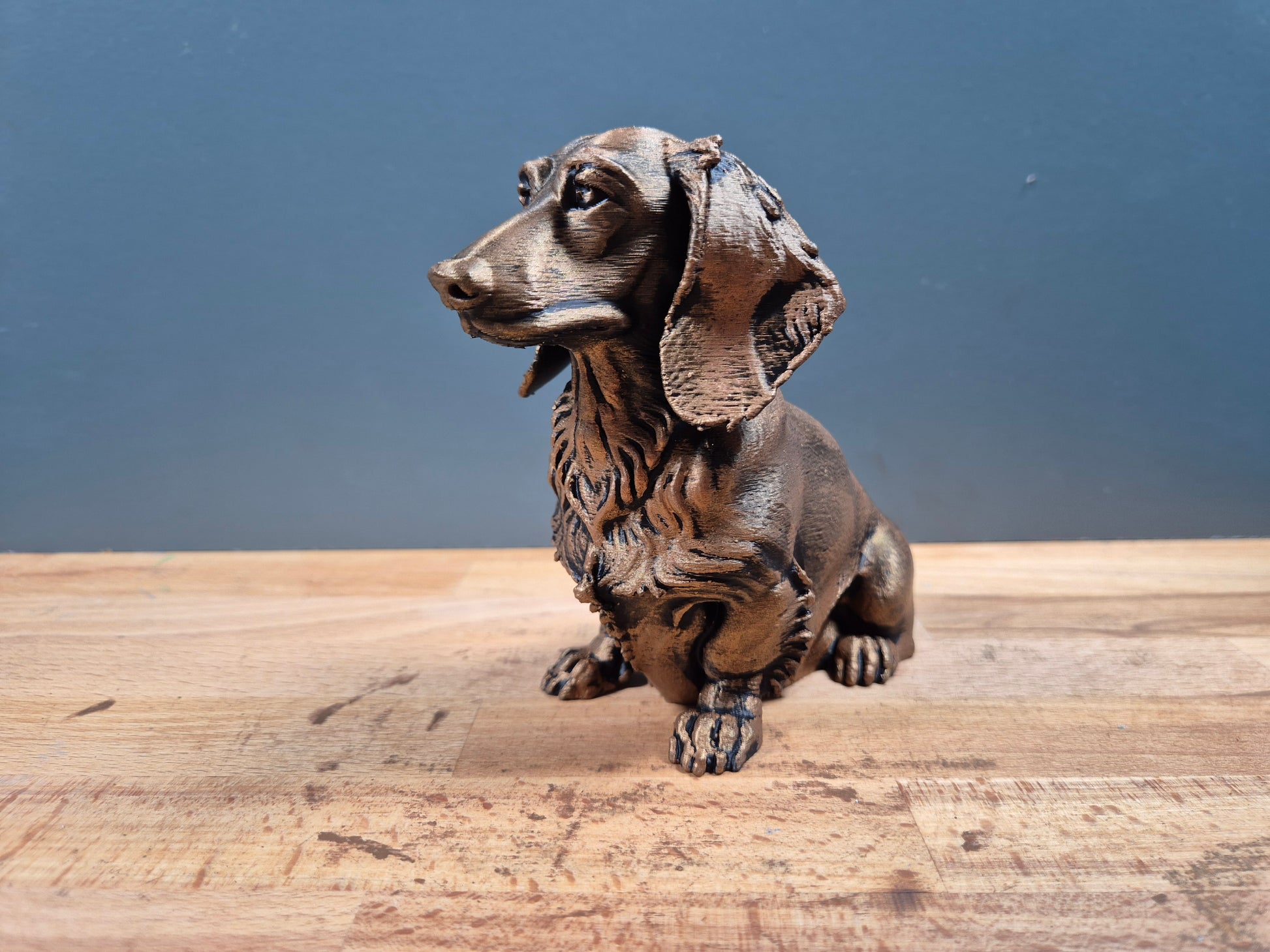 Sittställningen ger figuren ett lugnt och uppmärksamt utseende, vilket återspeglar taxens nyfikna och lojala natur. De detaljerade linjerna i ansiktet och kroppen framhäver rasens unika uttryck och gör figuren till ett dekorativt inslag i hemmet. Den passar perfekt på en hylla, i en bokhylla eller på ett skrivbord och kommer utan tvekan att glädja både hundälskare och samlare.