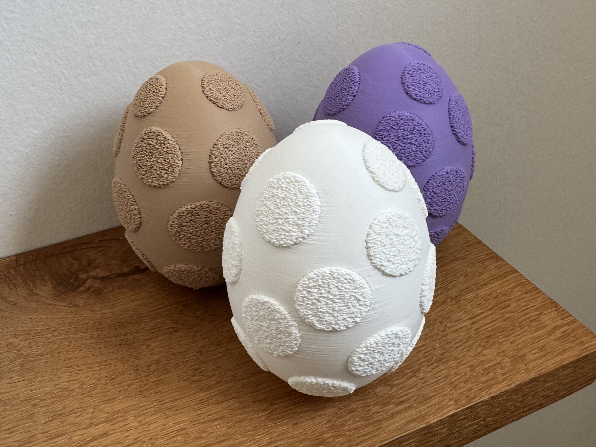 De distinkta prickarna är 3D-printade i ett speciellt "fuzzy mode" som ger dem en mjuk och texturerad yta. Denna kontrast mellan det släta ägget och de grova prickarna skapar ett vackert och iögonfallande utseende som ger värme och personlighet till dina påskdekorationer.